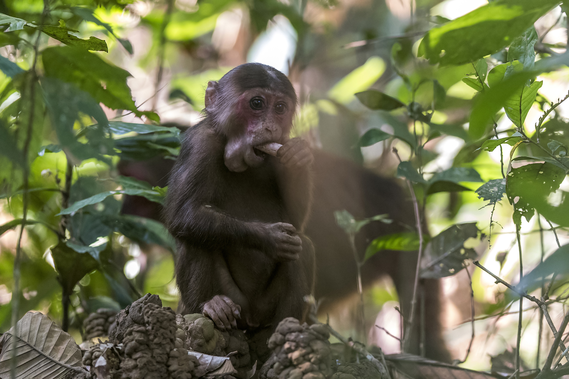 The sanctuary, interestingly, appears to have abundant food resources to offer to the growing stump-tailed macaque population. They consume fruits, shoots, tubers, flowers, as well as the leaves of various shrubs, trees, climbers, and the abundant bamboo. Their protein requirement is met by fungi and other small animals, such as frogs, slugs, and insects. There is minimum overlap in the diet of this species with the other primates that live in this forest, such as pig-tailed macaques, capped langurs, hoolock gibbons. There is limited overlap with the rhesus macaque, which occurs along the fringe areas of the sanctuary. This exclusivity in food resources could be one of the reasons that has led to a boost in the number of stump-tails in this threatened forest patch.
