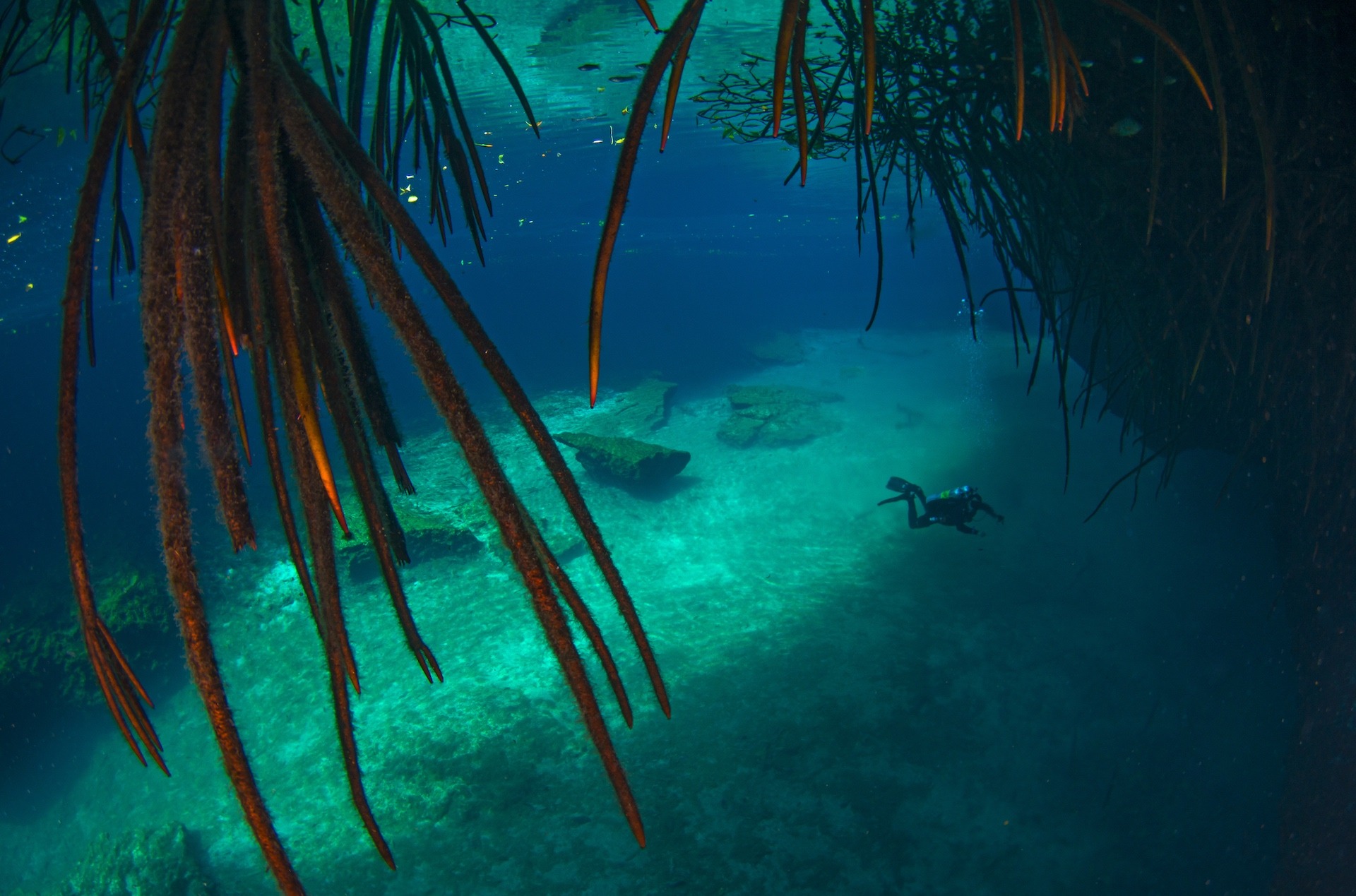 Even those who don’t dive can enjoy the lucent beauty of the cenotes as shafts of light pass through the transparent blue waters. Those who do dive can experience stalactites, stalagmites, pillars, unique underwater vegetation and mangroves, freshwater and saltwater separated by turgid haze. The cenotes are truly a world of their own.