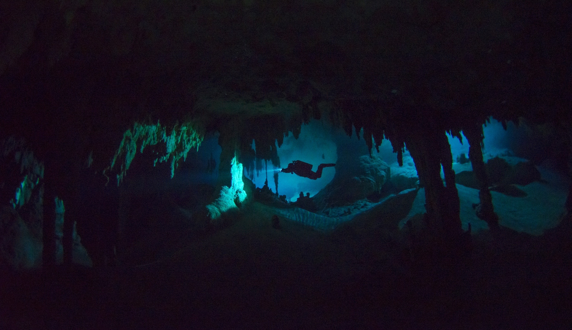 Narrow beams of light can be seen coming through the various entrances of the El Pit Cenote. The small entrance belies the size of the large cylindrical cavern we entered, which led further to many passages and caves. Ten metres down, an overhang with beautiful stalactites came into sight, and then, the hydrogen sulphide cloud, a mix in a turgid blur, followed by saltwater.