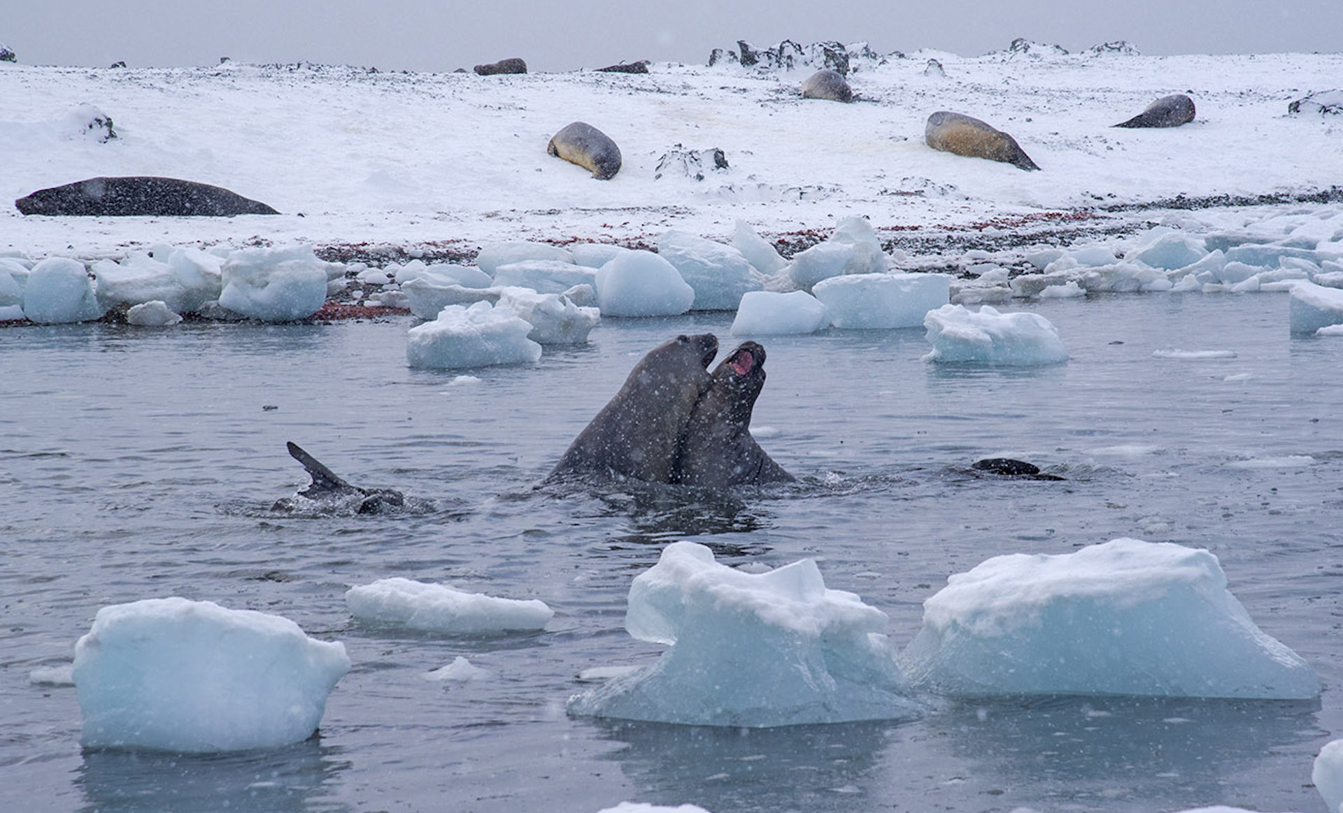 Antarctica is home to many species of seal, all armed with layers of blubber to protect them from the cold. The largest of these is the southern elephant seal, which grows to 20 feet and weighs up to 4 tonnes. Males can get pretty aggressive about territory, especially during breeding season when they must each gather (and protect) a harem of females.