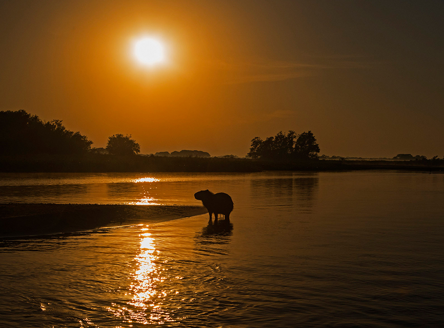 Huge populations of capybaras, the world’s largest rodents, live in the Pantanal. These animals are well adapted to life on both land and water, and are excellent swimmers. They will often sit close to each other, back-to-back, on an island in the middle of a channel, so they can keep a lookout for jaguars, their chief predator. This kind of spot is safe for them as it’s difficult for jaguars to reach them. They are also able to stay submerged when they need to stave off an enemy.