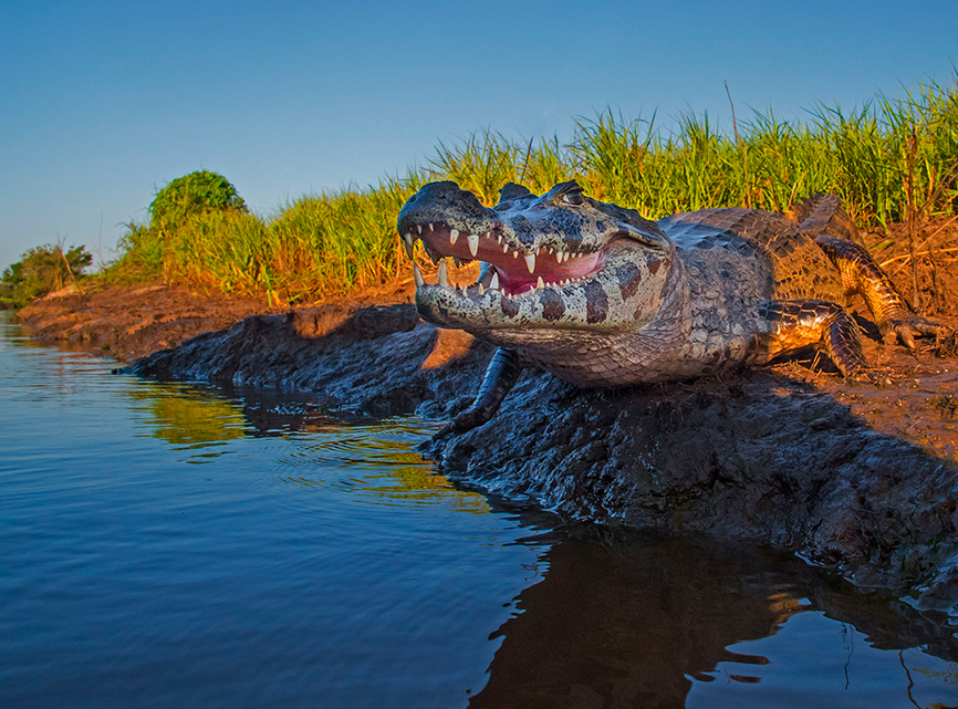 An estimated ten million caimans inhabit the Pantanal, making this the planet’s largest concentration of these crocodilians. Yacare caiman, the most widespread species, grow to eight feet in length. They were once heavily hunted for their skin, to support the coveted crocodile leather market. After the 1992 global ban on trade in crocodile skin, the caiman population has bounced back with vigour. Interestingly, this predator is also preyed upon in the Pantanal. In the shallow riverbanks jaguars regularly hunt caimans, sometimes killing adults twice their size. Caimans themselves mostly feed on fish, as well the occasional bird, small mammal, or other reptile.