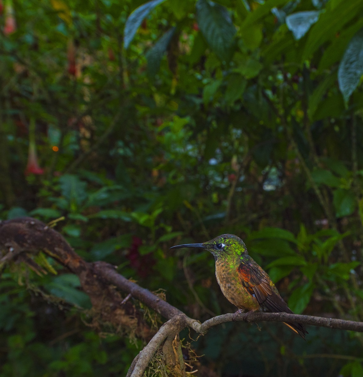 Over many millennia the hummingbirds in this region have evolved into numerous sub-species, each feeding on a specific group of flowers. This reduces competition, allowing them to co-exist within the rainforest, but also makes them more vulnerable to habitat loss. Clear the native forest and the hummingbirds are at a loss. In many cases, they simply cannot feed, because their bodies and beaks have been designed for the blooms of particular plants.