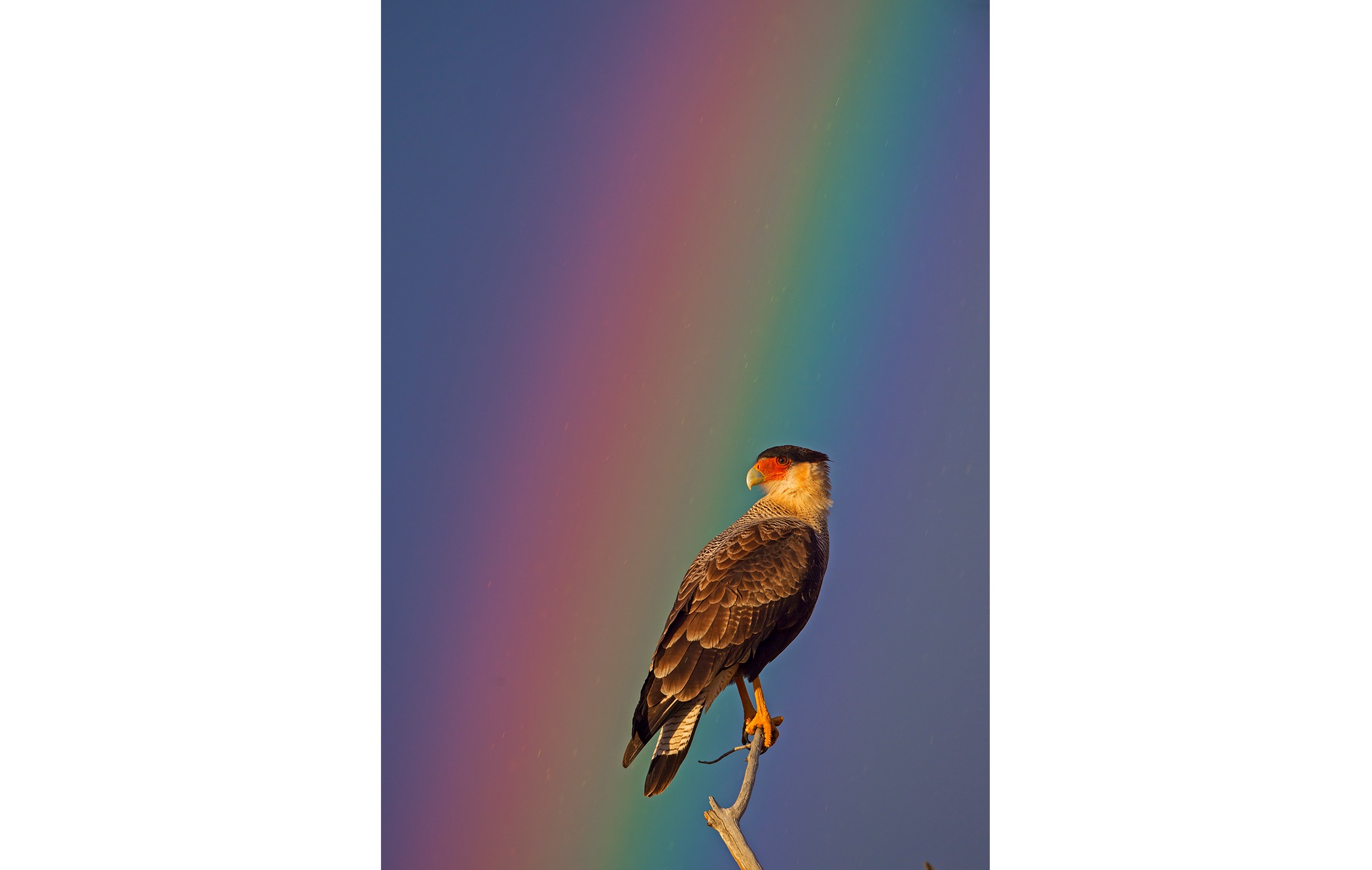 A fairly common bird in Patagonia, I caught this southern crested caracara feeding on an abandoned kill when it suddenly started raining and then stopped. A rainbow soon filled the sky and created the perfect backdrop for displaying the striking patterns on the plumage of this bird of prey. Locally called carancho, the caracara is the second largest falcon in the world and brazen in its hunt for food.