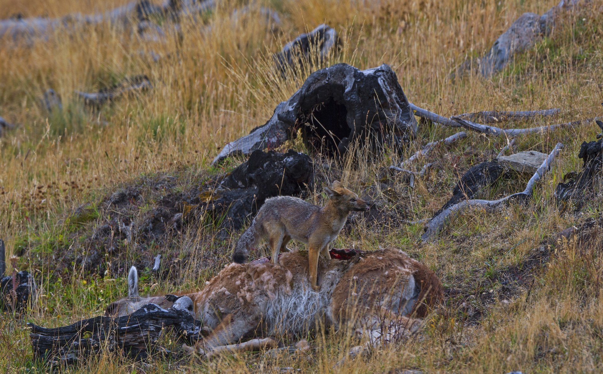 The guanaco’s main predator is the puma, or mountain lion. One of the reasons guanacos tend to live in groups is so that they can keep watch as a team and ward off pumas. When a puma is spotted too close, guanacos will give a warning call and flee. Pumas tend not to pursue the speedy fleeing guanaco too far. In the Torres del Paine, we spotted this guanaco downed by a puma. Pumas generally kill at night, and will sometimes sleep nearby and eat again in the morning. Not only will it feed, but other scavengers like this South American gray fox and other birds also enjoy the feast.