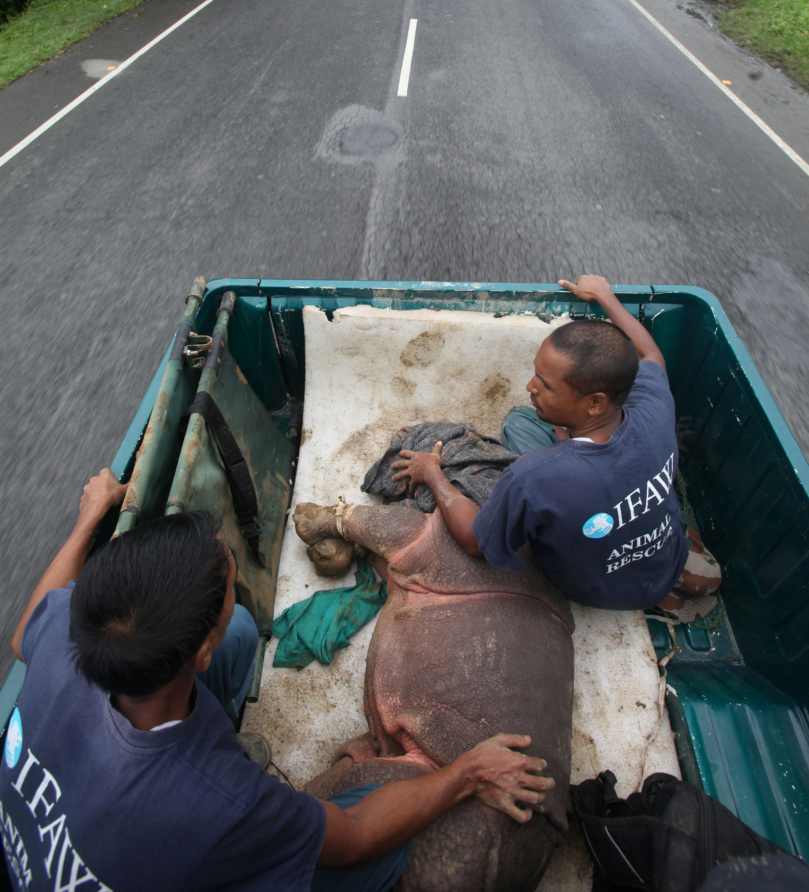 The flooding can be especially confusing for a baby rhino, like this young male that was separated from his mother and found in the backyard of a village house in Kaziranga. Fortunately, it was rescued by a team from the Centre for Wildlife Rehabilitation and Conservation, and fostered until the water level subsided. Photo: Subhamoy Bhattacharjee/IFAW-WTI