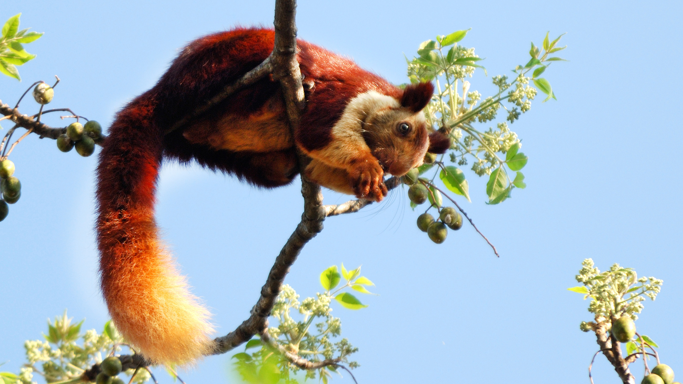 A Malabar giant squirrel looks like a bright ball of fur, topped with a tail that can be up to two feet long. Photo: Amoghavarsha